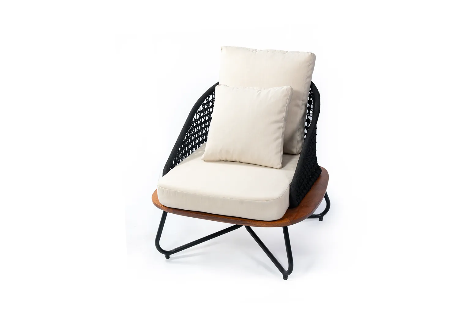 The Riviera Set features an aluminum frame, rope cushions, merbau wood, and a marble tabletop. With 1-year color fastness and durable foam, its sophisticated design and quality materials make it perfect for any outdoor lounge area.